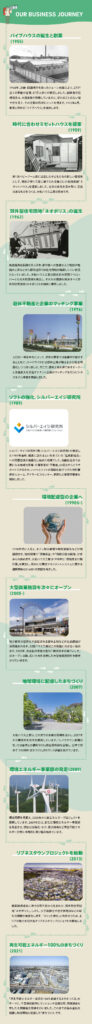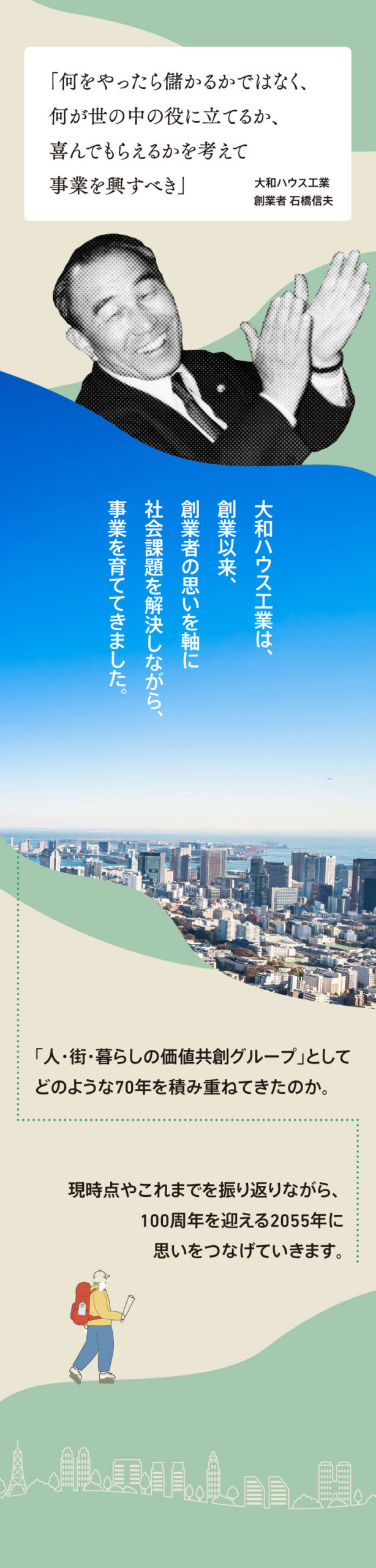 大和ハウス工業株式会社様のホームページ内の記事Sustinable Journeyにおけるインフォグラフィックデザインを担当しました。今回は「大和ハウス工業の70年を旅しよう。サステナブルな100年経営に向けた思い」と題して、これまで社会や生活者に寄り添い、どのように事業を進めてきたのか、そして2055年の創業100周年に向けてどんな未来を描いているか、70年の歩みと未来への思いを伝える内容でした。